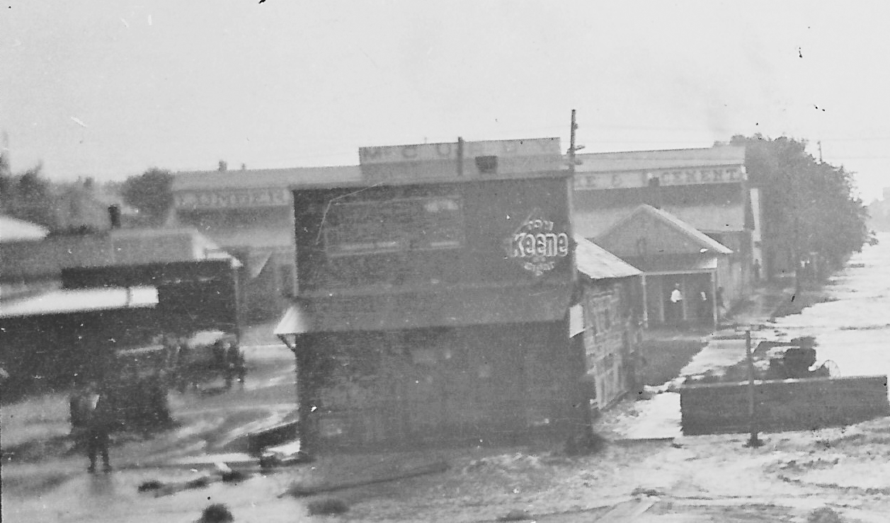 It is believed that brothers James and William Weeks of Kinsley built four adjoining wood frame buildings on those lots south of the creek around 1885. The brothers were in the cattle business and built a successful lumber yard south of the railroad tracks.